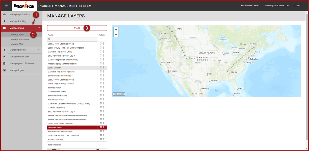 Access the Admin Manager Application by clicking on the Admin Manager button on the fiResponse Web Applications landing page. Map layers can be added, edited, or deleted using the Manage layers tab. Users can manage which layers are visible on desktop, web, or mobile by using the Manage TOC (Table of Contents) tab. This page is divided into two parts, Manage layers and Manage TOC to clearly explain each task.