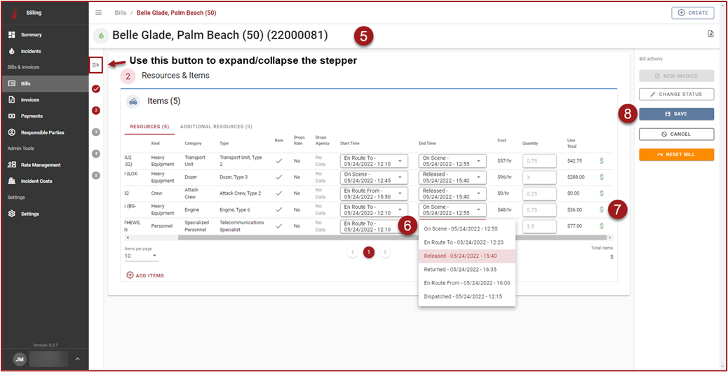 On Step 2: Resources & Items the resources assigned to the Incident will be displayed in the grid.