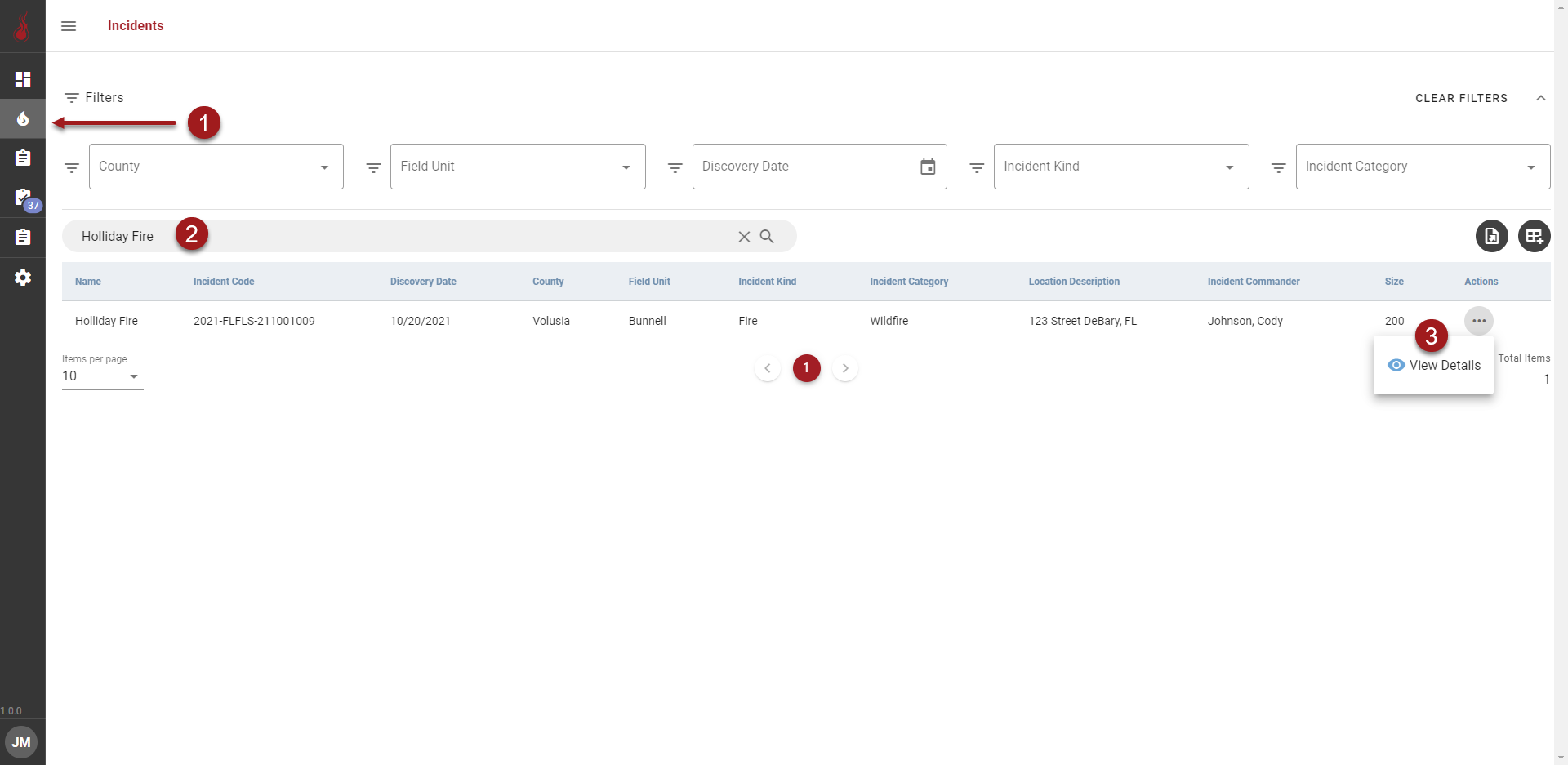 Use the Search pill to perform a wildcard search for the Incident Name. You must press “Enter” on the keyboard to perform the search.