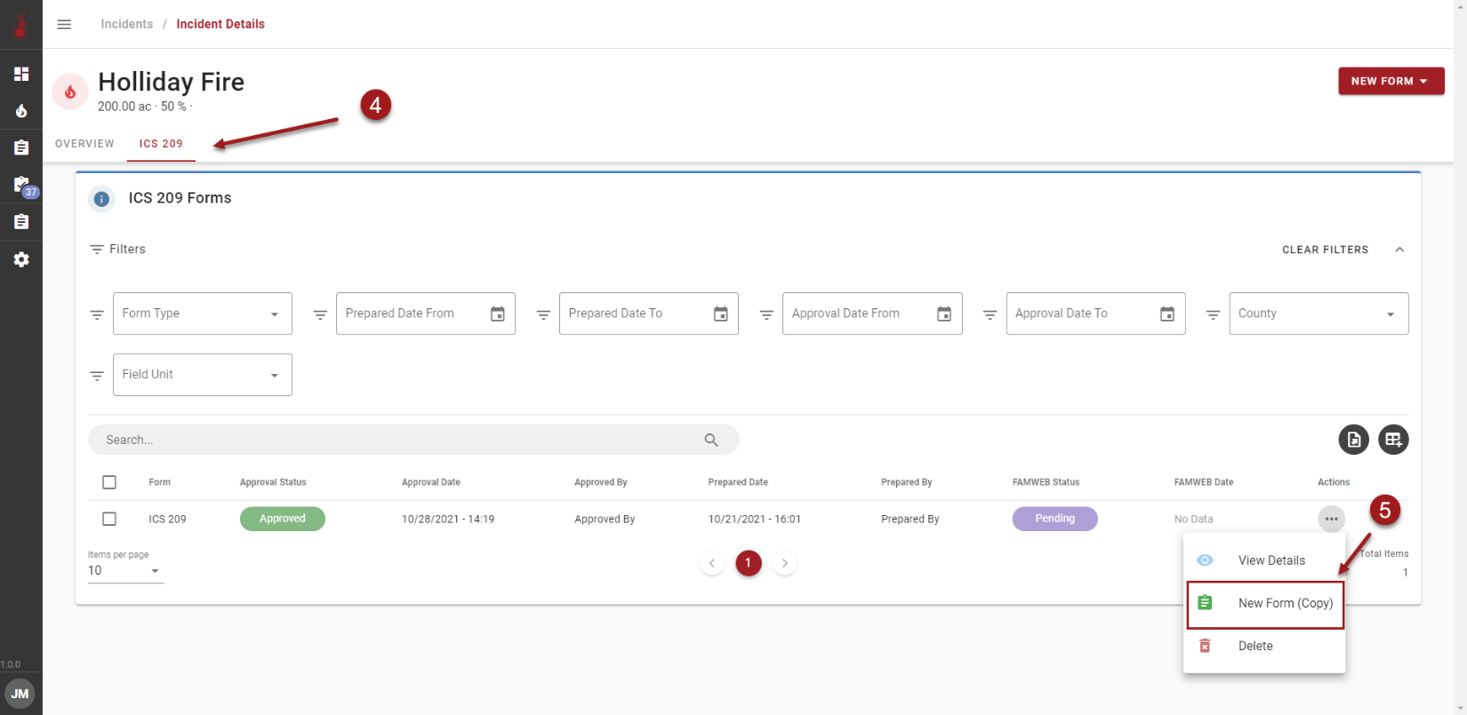 Click :3dots: on the row for the preferred incident and click :NewFormCopy:. The “New Form (Copy)” button will pull a “fresh snapshot” of data from fiResponse and will copy the contents of the manual write-in fields from the selected form.